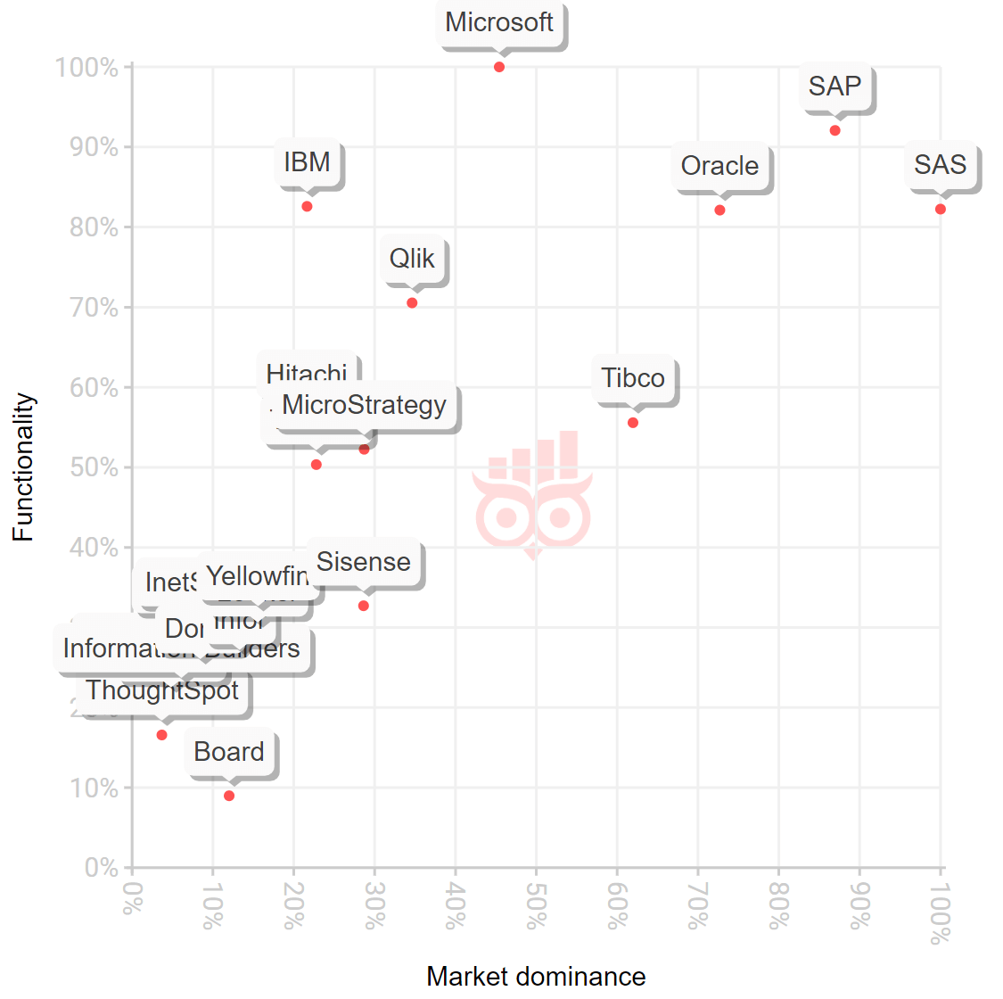 The above graph displays the comparison ‘Oracle BI vs SAS BI’. NOTE: the core analytical functions and features were calculated and displayed at the vendor level (Oracle vs SAS) were considered. Download now the BI & Analytics Guide to create your own BI software comparison matrix.